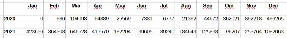 Observing the tables we note that March and April 2020 recorded almost one hundred thousand cases each, while already in May the cases decreased sharply to only twenty-five thousand. Considering that May 2021 alone has totaled 18,200 it is hard to believe that things with those kind of unmentionable drugs have improved; but this huge gap is due, as already mentioned and as we will see later, mainly to the disproportionate amount of tests carried out in 2021 rather than to an increased infectivity of the virus.