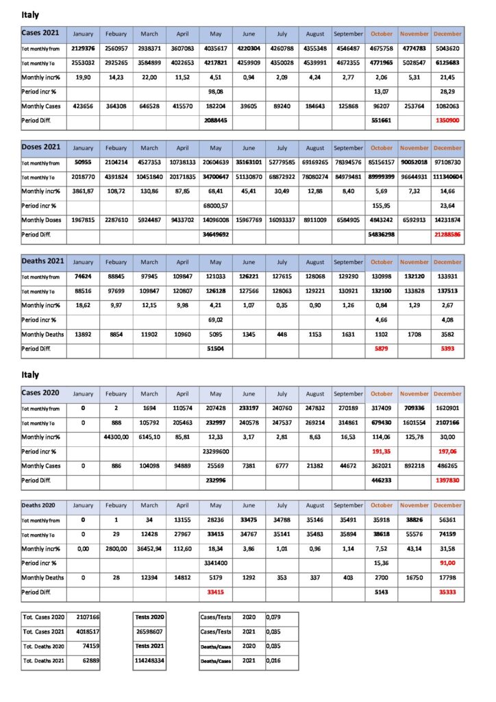 We close our this first survey relating to the covid comparison of these two years, inviting the reader to consider that even today, January 31, 2022, the Italian Statistical Institute ISTAT has not disclosed the data on Italian mortality for the months of November and December 2021. It is too early to draw conclusions, but their delay does not bode well. We hope to wrong this our prediction.