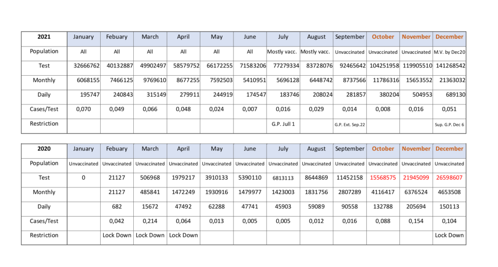 Before concluding the 2020 – 2021 comparative exam, it is necessary to comment on the results shown in the table below, which details the monthly variation of the Case / Test ratio, contextualizing the data within a regulatory framework, which unfortunately we have seen repeated throughout the world alike.